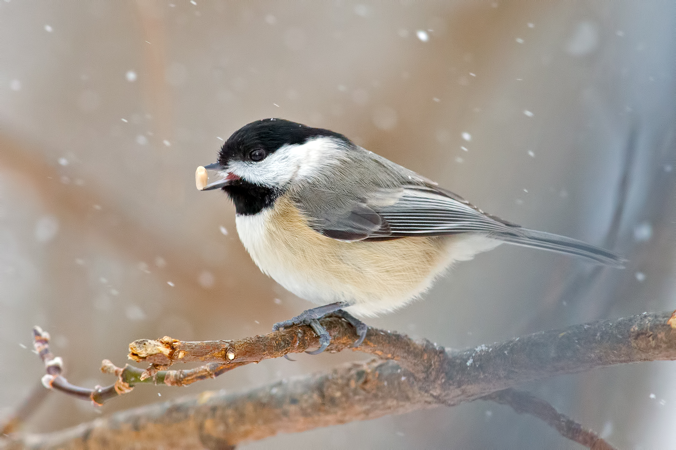 Even though they tend to follow a social hierarchy at the feeder, a chickadee won't linger long. What they will do is grab one seed and fly away with it. Perhaps they will set it on a branch and peck an opening into the husk. Or maybe the chickadee will hide it in the bark of a tree. In any case, a chickadee is capable of recalling thousands of hiding spots.