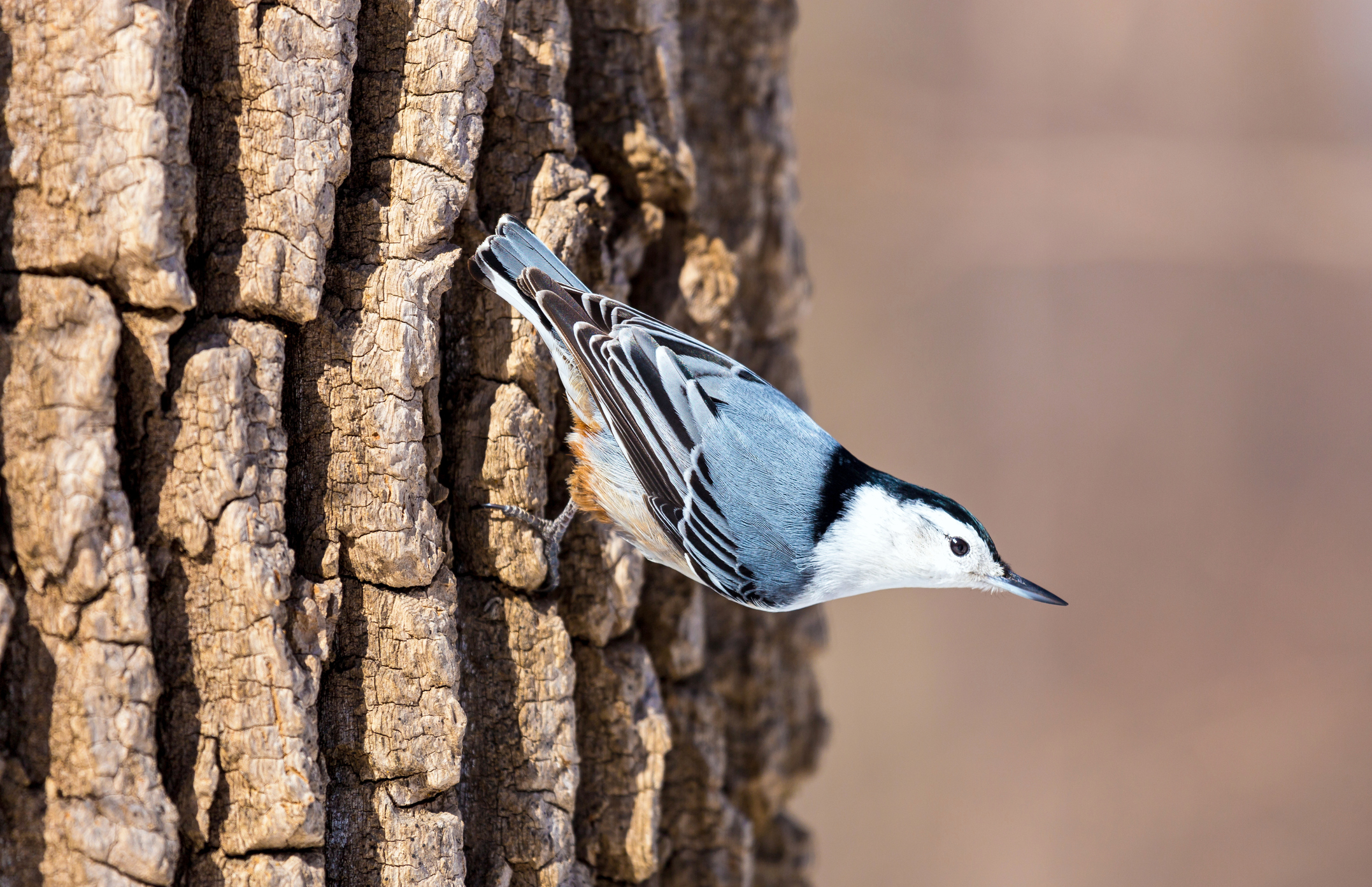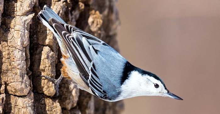 You might say the White-breasted Nuthatch is one with the trees. They can "stand" in just about any position or angle, as their feet cling effortlessly to the bark. This ability to maneuver sideways and upside-down comes in pretty handy, actually, because it makes the insects they so love to eat so easy to reach.