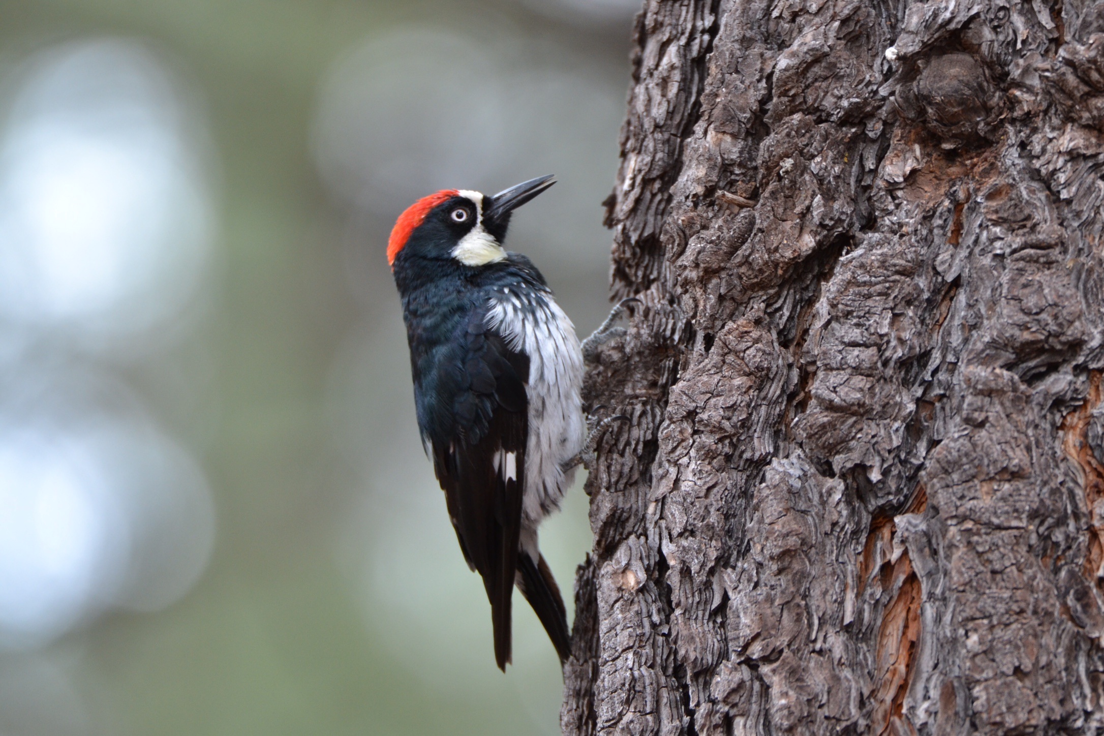 In their granary tree, you’ll find a single nest cavity where a select group of females lay eggs. All members of the flock contribute to the feeding and care of the nestlings. (To truly appreciate the unique communal lifestyle of the Acorn Woodpecker, this article by the Cornell Lab of Ornithology is a must-read.) If you happen to stumble across one of the bird's granary trees, stop and watch these birds interact and spread their handsomely marked wings in a show of display.