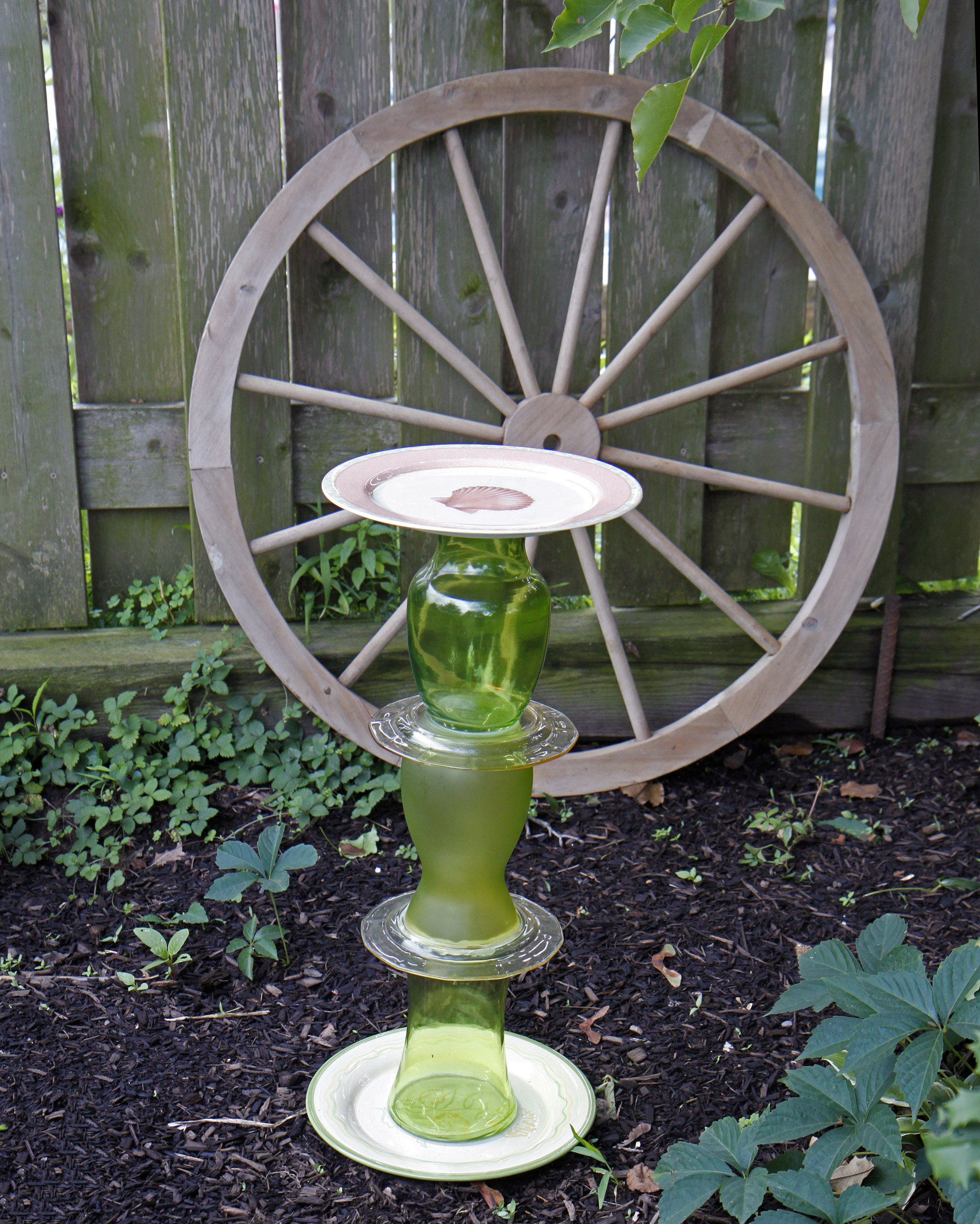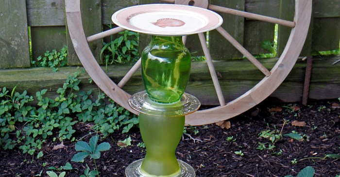 Create a splash in your garden with a unique birdbath from old dishes and vases.