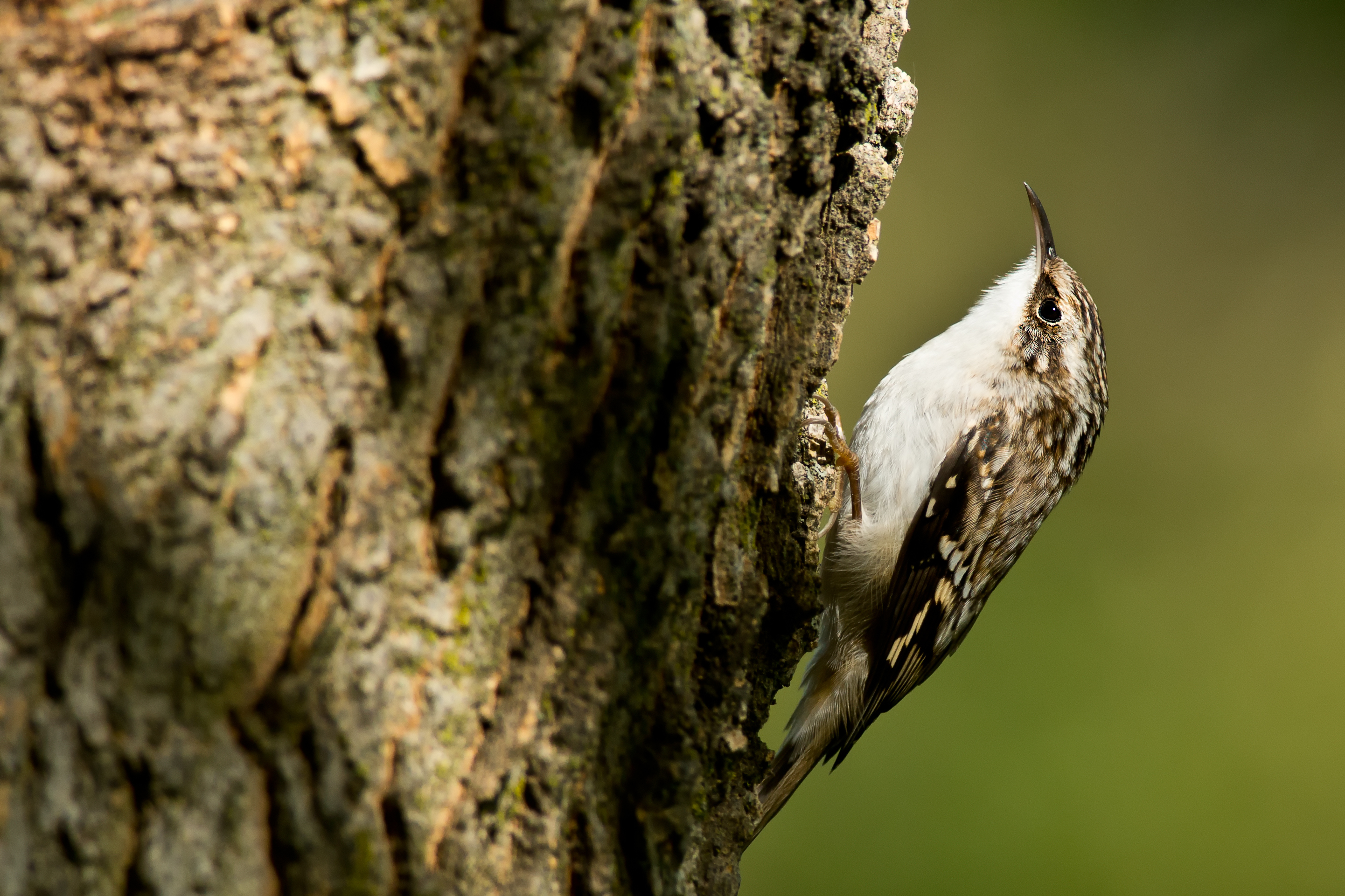 In the spring, they build unusual but well-disguised nests, tucked behind a large piece of bark of an old or dying tree, raising just one set of hatchlings per year. In the summer, you’ll see them "walking" up and down tree bark, preferably the thick bark of an old tree, probing with their needle-like beaks for spiders, insects and larvae. Since they camouflage so well, it’s much easier to find them by sound than by sight.