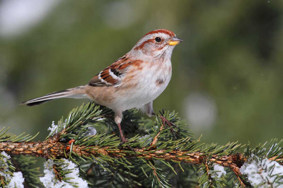 The sweet song of the American Tree Sparrow is sure to gladden the heart of any winter-weary bird lover. Sometimes called the “winter sparrow”, this bird is common in all but the southernmost states of the U.S. from fall to winter. In late winter, males begin to sing their high-pitched whistles in hopes of attracting a mate to raise a brood of chicks within their summer home in the Alaskan and Canadian tundra.