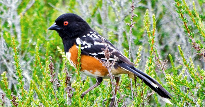 Out in the scrubby, open habitat of the Western U.S., the Spotted Towhee uses a unique move that helps them find food. With a backwards hop, these ground foragers will "scratch" back the leaf litter and then dart forward to snap up the newly exposed insects.