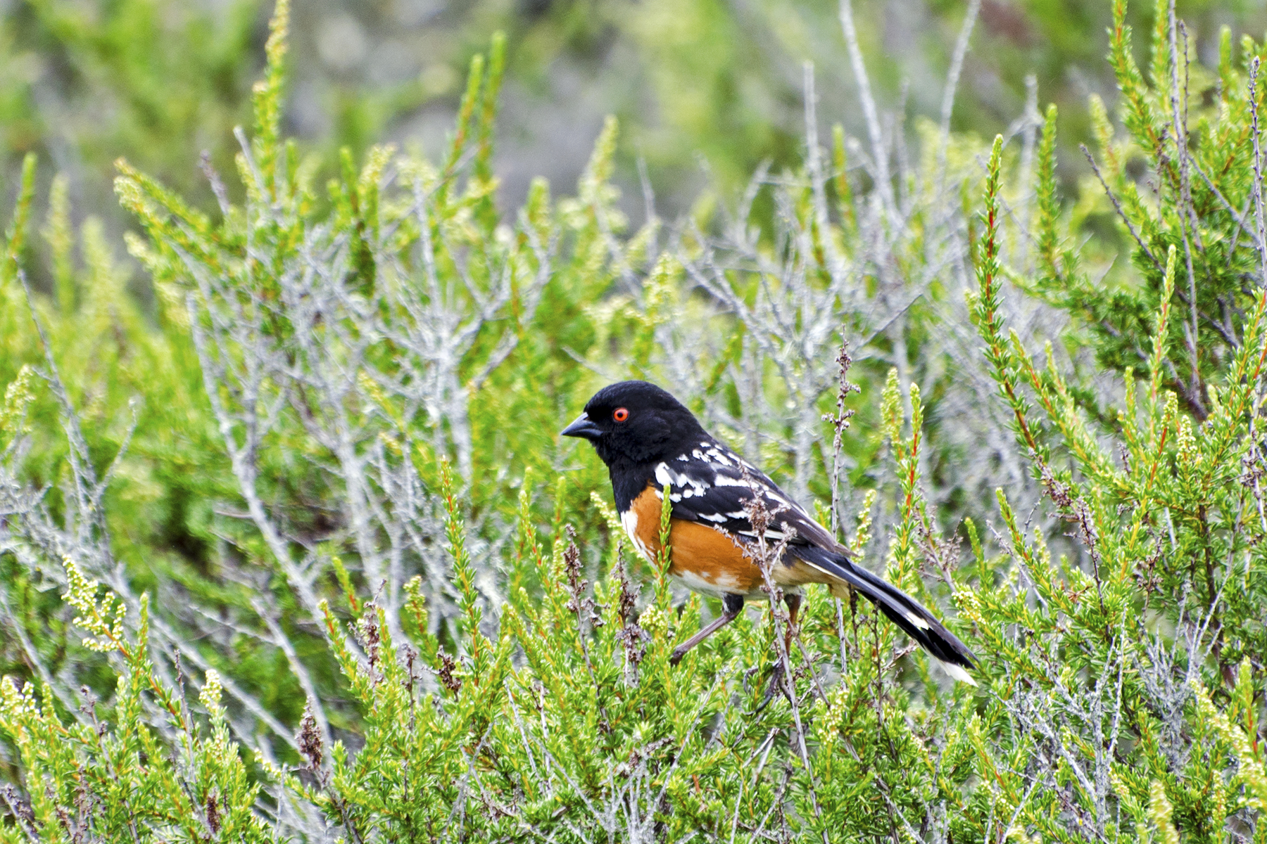 During the warm weather months, the Spotted Towhee focuses its foraging efforts on insects: beetles, grasshoppers, crickets, ladybugs, caterpillars, moths, bees, wasps and also spiders. In the winter, they’ll be on the lookout for seeds and berries that are clinging to the plants.